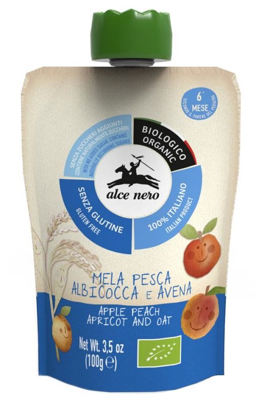 Purea di mela* (80%), purea di pesca* (13%), purea di albicocca* (5%), farina di avena* (2%).