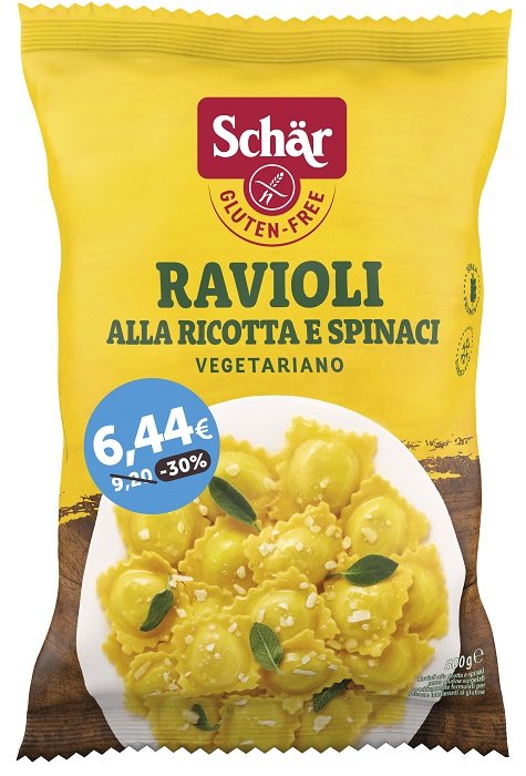 Pasta all’uovo 60% [uova 30%, amido di mais, farina di riso, amido di tapioca modificato, albume (uovo) 2%; emulsionante: mono e digliceridi degli acidi grassi; addensante: gomma di xantano], ricotta vegetariana 30% (siero di latte, latte; correttore di acidità: acido lattico), spinaci 6%, formaggio vegetariano (latte, sale, enzima coagulante microbico), albume (uovo), fibra vegetale, sale.